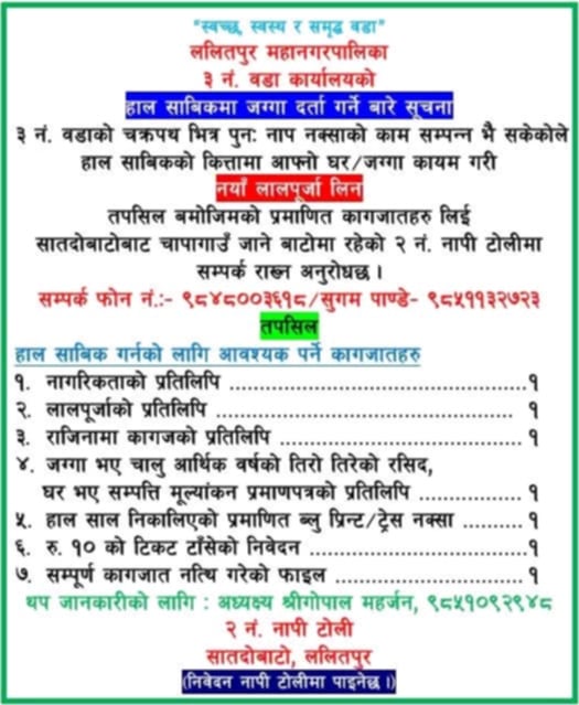 आ.व. ८२/०८३ मा शिक्षा र स्वास्थमा ७ वडा निवासीहरुलाई आवश्यकता अनुसारको अनुदान सहयोग हुने ल.पु. म. न. पा. वडा ७ को नीति अनुरुप ल.पु.वडा ८ बाट ल.पु. वडा न ७ मा स्थायी आवासीय बसोबास गरिदै आउनु भएका प्रकाश महर्जनको सुपुत्रले २०८१ सालको SEE मा 4 GPA प्राप्त गरि उत्तीर्ण हुने तेजन महर्जनलाइ अध्यक्ष कुलबहादुर महर्जन…